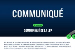 应巴黎圣日耳曼的要求,为了更好地备战与切尔西的欧冠联赛1/8决赛两回合比赛,经与南特俱乐部协商,法国职业足球联盟理事会决定将巴黎圣日耳曼与南特的比赛推迟至4月20日当周进行。确切比赛日期和开球时间将稍后公布。