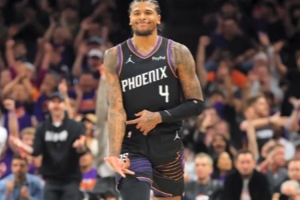 本来按咖位,这场该是布克vs库里,2024奥运会美国男篮的冠军后卫对决——他俩本季的份额也意外地接近:布克场均18.7投,26.1分3.9篮板6助攻;库里场均18.6投,26.6分3.6篮板4.7助攻——还都搭档过杜兰特,身边还各有个跟杜兰特结仇的恶汉(狄龙和追梦)。